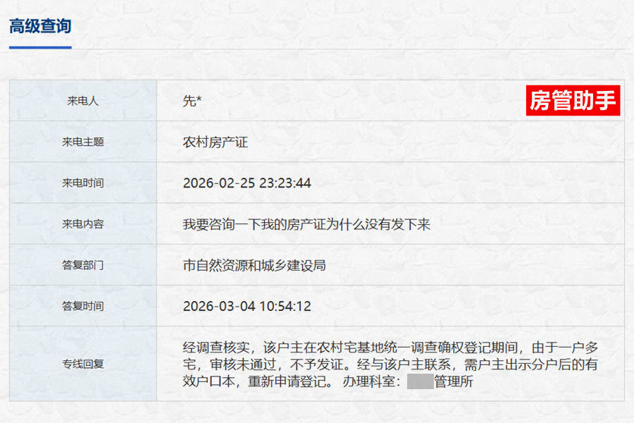 如果不清楚所在农村宅基地确权登记进度,可以前往村委办公室咨询,或者在房管助手公众号回复“农村政务网”,进入省级政务服务网,搜索“宅基地登记”,进入所在城市、区县宅基地使用权及房屋所有权登记办事指南,通过“办事指南”中的联系电话咨询当地自然资源局不动产登记部门。